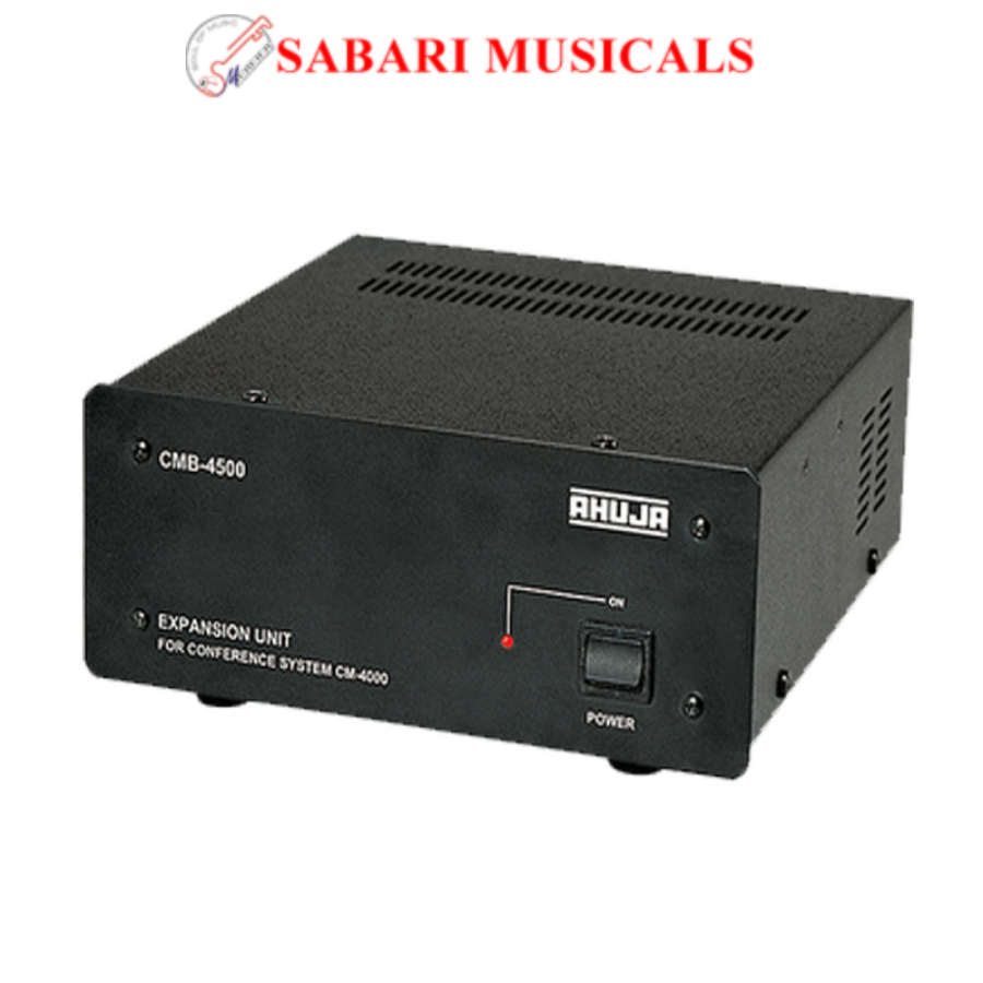 -Model: Ahuja CMB-4500 Conference Expansion Unit -Compatibility: Designed for use with the CM-4000 series conference system -Purpose: Facilitates the addition of more delegate units to the conference system -Interconnection: Provides interconnection with the Central Amplifier CMA-4400 -Power Supply: >AC Operation: 220-240V AC mains >DC Operation: 24V car battery -Dimensions: W228 × H88 × D260 mm -Weight: 3.40 kg -Power Consumption: 140 VA -Fuses: >AC Fuse: 1 × 2 Amp >DC Fuse: 1 × 10 Amp