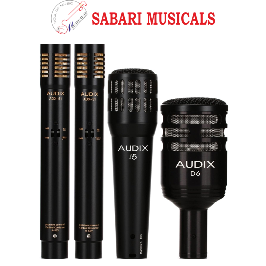 Applications – All-in-one solution for miking drums – Instrument specific mics for optimal results – Rugged Audix quality – Great for stage and studio – Road case Specifications: Box Contents: 2 x ADX51 Overhead Mics 1 x i5 Snare Mic 1 x D6 Kick Drum Mic 3 x MC1 Mic Clips 1 x DVICE Rim Mount 2 x WS81C Windscreens Aluminum Road Case Audix i5 Audix D6 Audix ADX51 Transducer Dynamic VLM Type B Dynamic VLM Type E Condenser Frequency Response 50 Hz – 16 kHz 30 Hz – 15 kHz 40 Hz – 18 kHz Polar Pattern Cardioid Cardioid Cardioid Output Impedance 150 ohms 280 ohms 100 ohms Sensitivity 1.5 mV / Pa @ 1 k 0.8 mV / Pa @ 1 k 17 mV / Pa @ 1 k Maximum SPL ≥140 dB ≥144 dB ≥132 dB OFF-axis rejection ≥23 dB ≥20 dB ≥15 dB Power Requirements None None 9 – 52 V Phantom Materials / Finish Die Cast Zinc Alloy/ Black E-coat Machined Aluminum / Black E-Coat Machined Brass / Black E-Coat Weight 250 g / 8.8 oz 255 g / 9 oz 150 g / 5.3 oz.