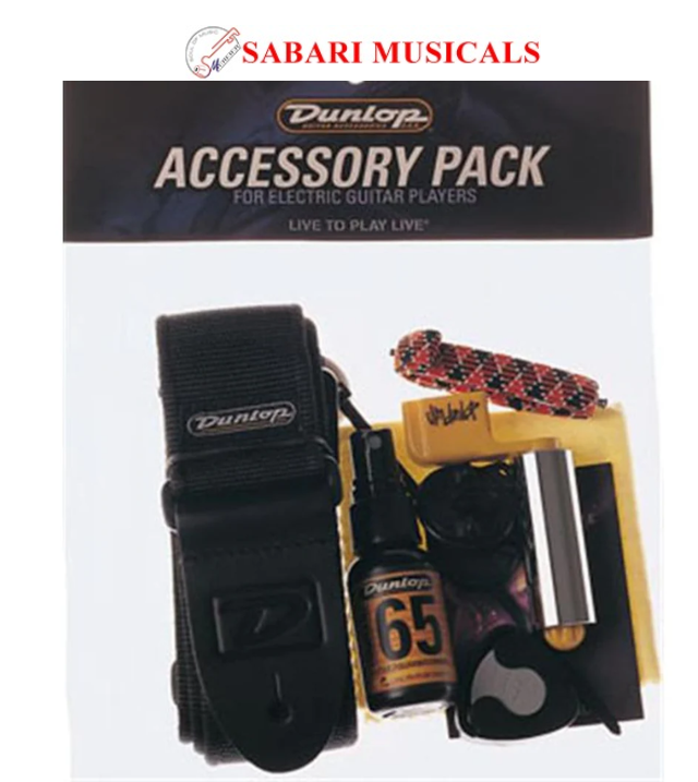 Dunlop GA51 Electric Guitar Accessory Pack With Strap, Pick, Slide and Polish Dunlop’s accessory pack provide essential items for both the starting and seasoned guitarists. Get yourself gig-ready with Dunlop’s time saving and maintenance accessories. GA51 Pack Includes: Tortex .60 mm pick Nylon .60 mm pick Shell Classic medium pick Dunlop Pick-holder Formula No.