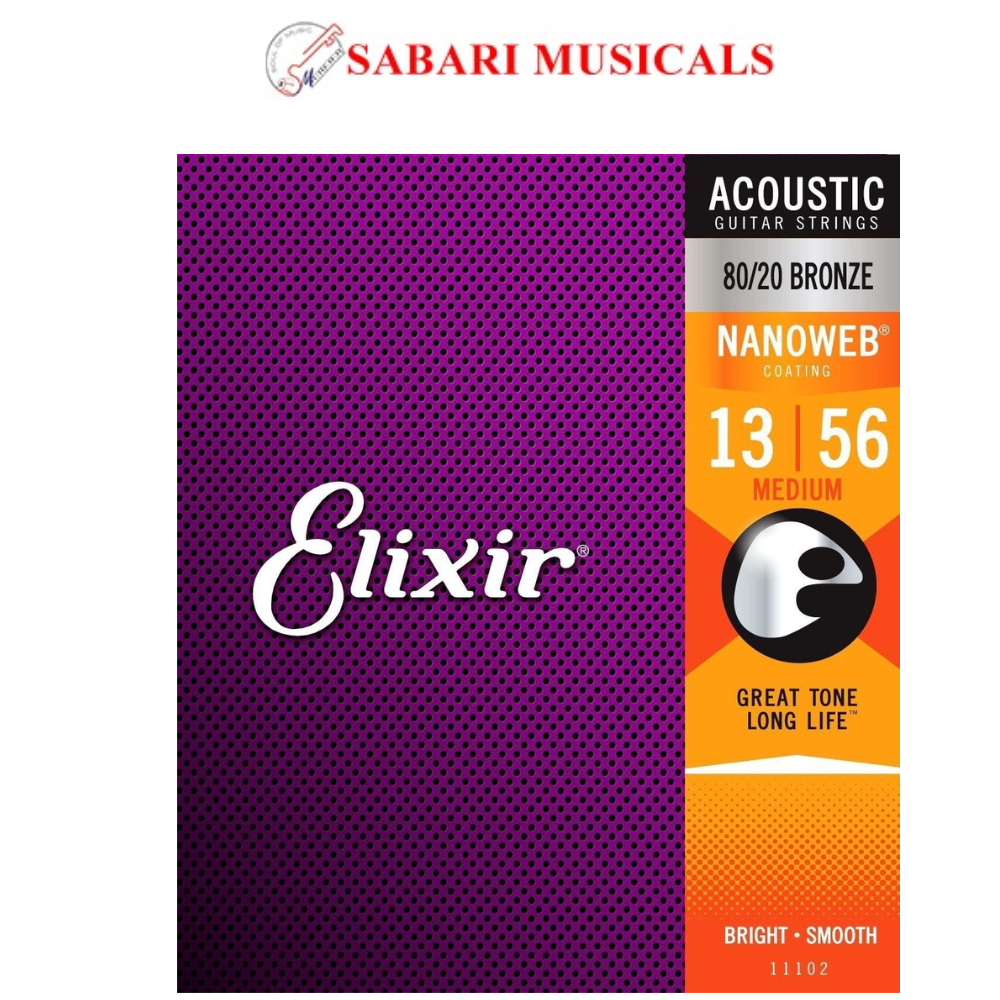 Elixir 11102 80/20 Bronze Nanoweb Coating Acoustic Guitar Strings, Medium, 13-56