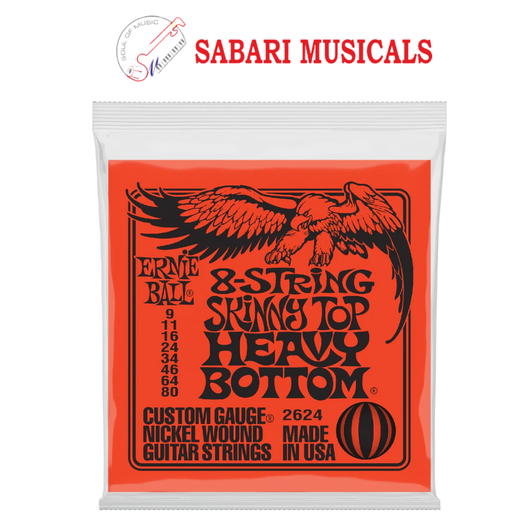 Ernie Ball 2624 Skinny Top Heavy Bottom Slinky 8-String Electric Guitar Strings – 9-80 Gauge Overview: Ernie Ball Nickel Wound Electric Guitar Strings are made from nickel plated steel wire wrapped around tin plated hex shaped steel core wire. The plain strings are made of specially tempered tin plated high carbon steel producing a well balanced tone for your guitar. Gauges .009, .011, .016, .024, .034, .046, .064, .080.