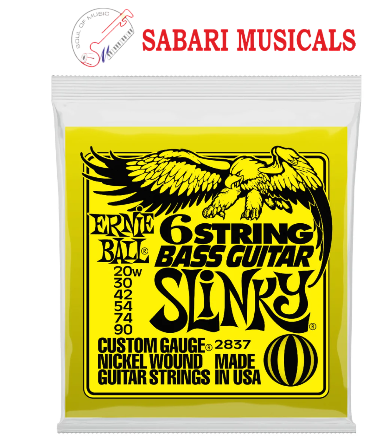 Ernie Ball 2837 Slinky Bass Guitar Strings 6-Strings With Small Ball End 29 5/8 Scale – 20-90 Gauge Overview : Ernie Ball Nickel Wound 6-string Electric Bass Strings are made from nickel plated steel wrapped around a hex shaped steel core wire.