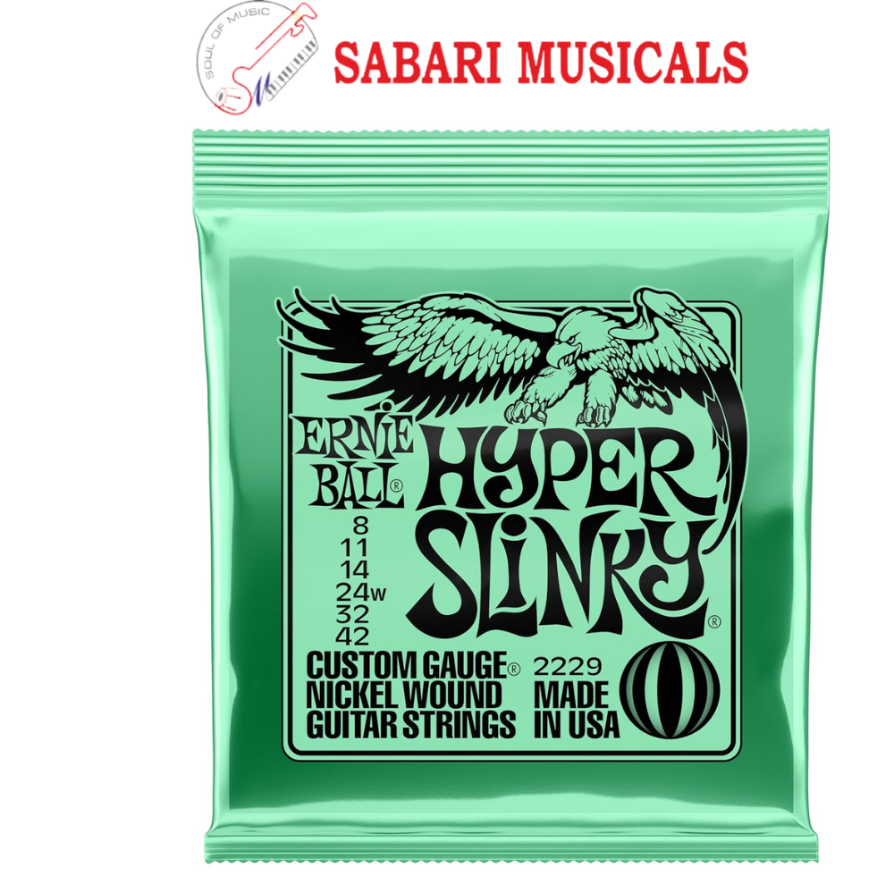 Hyper Slinkys sit neatly between the popular Super Slinky and Extra Slinky strings while providing a light, fast feel with slightly less tension on the top strings. This combination is perfect for players who are looking for added playability with minimal differences in tone and tension to the Super Slinky strings. Gauges .008, .011, .014, .024w, .032, .042