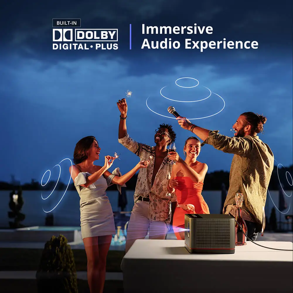 The ETOE Whale Pro projector boasts dual speakers (2*10W), providing you with an immersive theater audio experience. With various sound modes, such as standard, movie, and music modes, users can also create their own custom sound modes for optimal audio performance. With its Dolby Audio certification, it ensures high-quality sound for a captivating audiovisual journey.