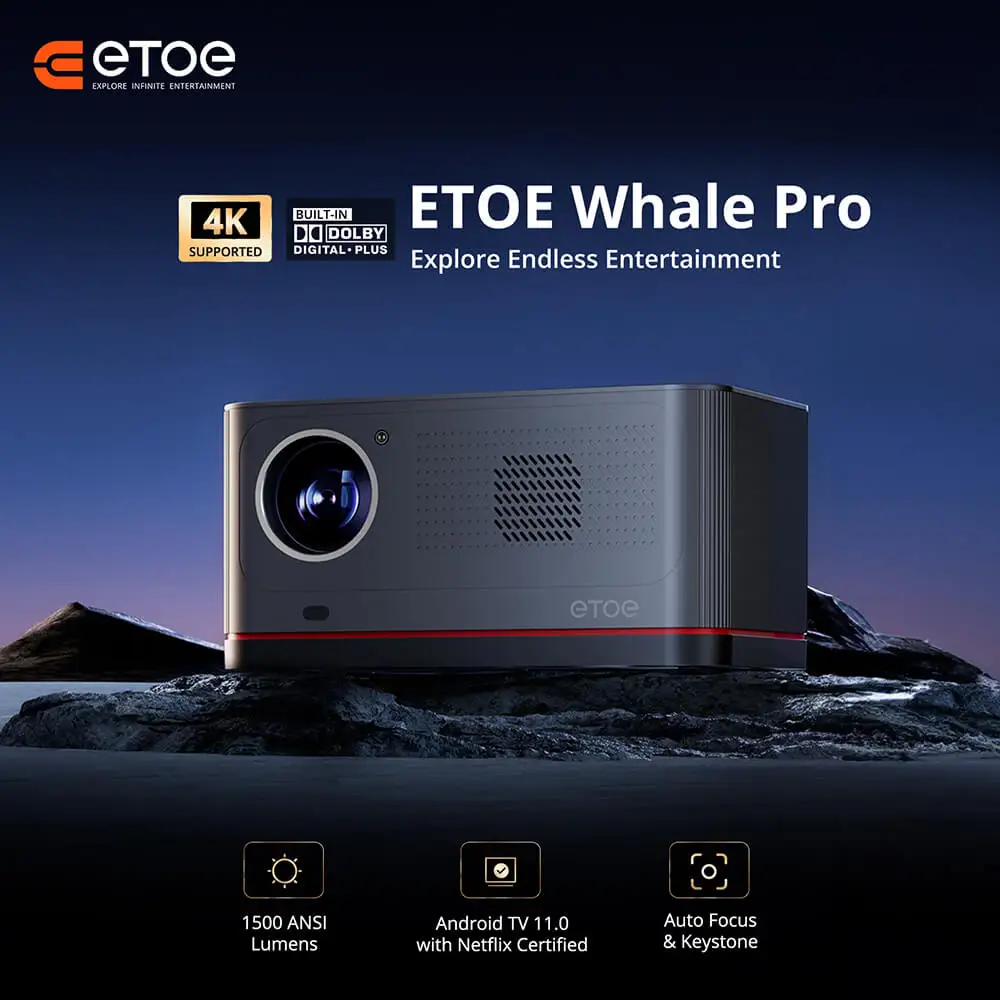[Netflix & Android TV Certified] ETOE Whale Pro 1500 ANSI Projector, Native 1080P, 4K Decoding, WideVine L1, Auto Focus & Auto Keystone Correction, 2*10W Stereo Speakers, Dual-Band Wi-Fi