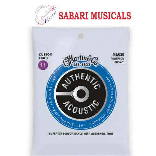 Martin MA535 Custom Light 11-52 Traditional Phosphor Bronze Acoustic Strings Martin Authentic Acoustic Superior Performance SP strings feature higher tensile strength and tin-plated core wire on all six strings that enable a fuller and more balanced tone, quicker response and increased tuning stability. Our impeccable standards for acoustic guitar tone are embedded in our string design and precision manufacturing process. That’s why we make our own.