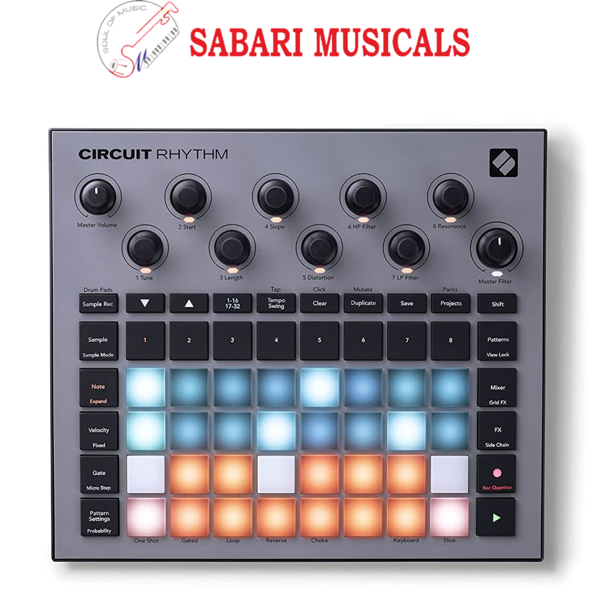 The Circuit Rhythm offers eight flexible sample tracks with several sample capabilities including slice, chromatic, one-shot, gated, looped, and reverse. The machine provides a variety of sample controls including tune, start, length, slope, distortion, high-pass filter, low-pass filter and resonance. What’s more, there is a sample choke function that allows you to assign samples to a group, where by any sample that is playing is automatically cutoff when a new sample in the group is triggered. Great for creating realistic hi-hats and other sounds.