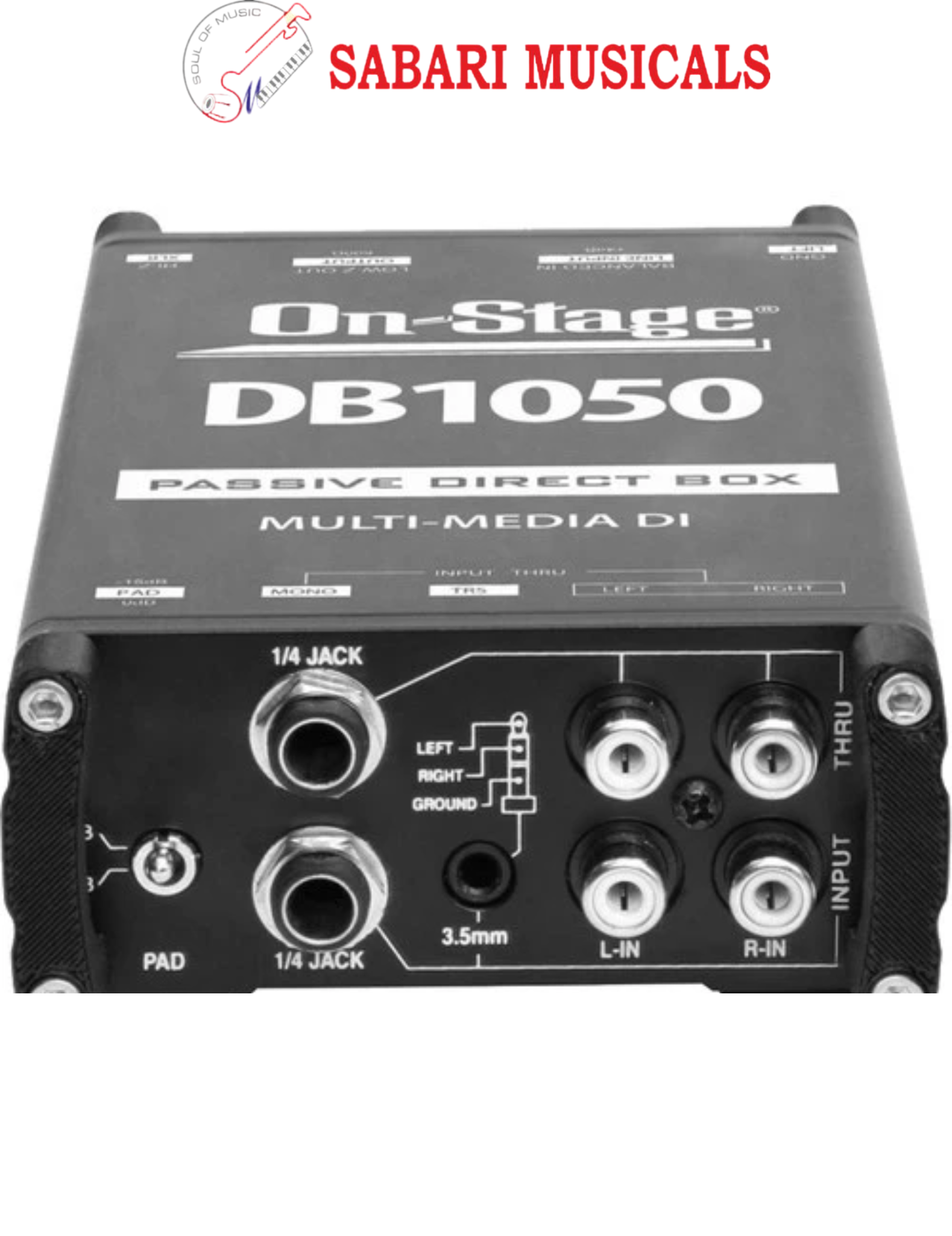 On-Stage DB1050 Passive Multimedia DI Box Overview: DB1050 Passive Multimedia DI Box converts any line-level stereo source to a low-impedance XLR mono signal ready to send via a long cable run to a mixer or PA system.