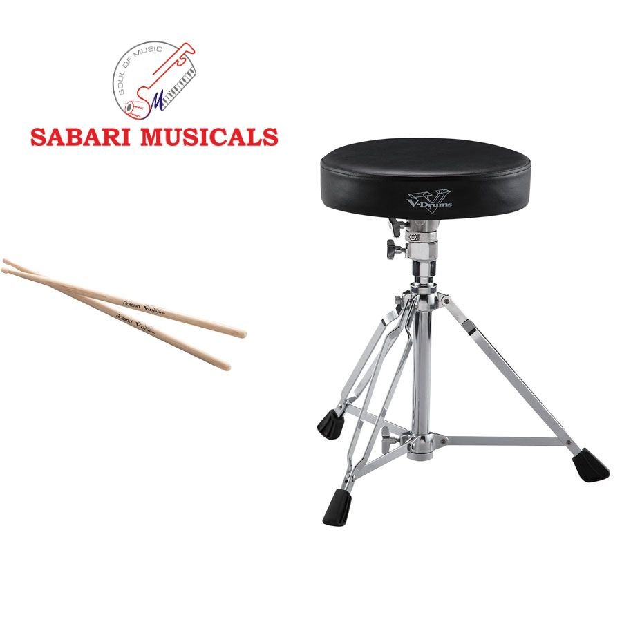 Start playing your new V-Drums set right away with this handy accessory package. It features a matched pair of high-quality hickory drumsticks with the V-Drums logo, plus a rugged, double-braced drum throne that will provide comfortable support through years of heavy drumming sessions.