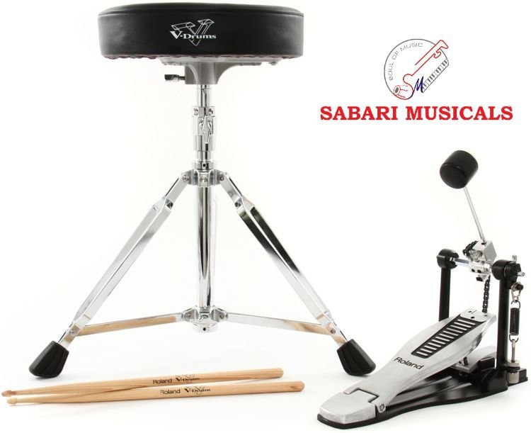 This handy drum accessory package is recommended for entry-level drummers, as it enables them to play their V-Drums right out of the box. Components include a pair of hickory-made drumsticks sporting the V-Drums logo, a kick pedal with new embossed Roland logo footplate, and a drum throne with double-braced tripod for years of reliable use.