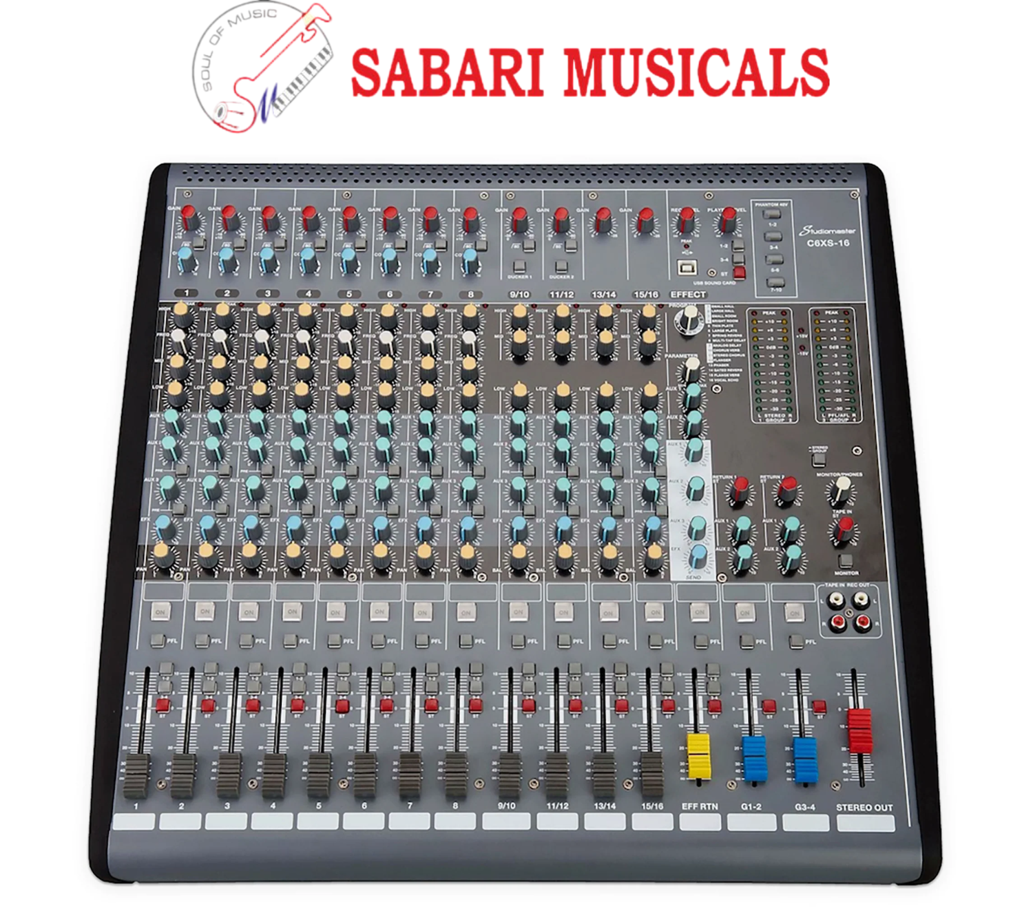 Studio Master C6XS-16 16 Channel Compact Mixer Overview: 16 inputs 10 mic channels 4 stereo channels 3 band EQ 4 auxiliaries 16 DSP effects USB for recording and playback Specifications: Channels: 16 Mic Inputs: 10 Stereo Inputs: 4 Frequency Responce: 20Hz – 20kHz (+1/-3dB) Mic Gain Range: 15dB to 60dB EIN:  -128dB THD Mic Channel: <0.1% EQ: Hi 12kHz, Mid 500Hz – 2.7kHz, Lo 100Hz, Lo Cut 100Hz USB Audio: Record and Playback DSP Effects: 16 programme DSP effects unit Output Levels: Max +28dB (Bal), +22dB (unBal) Power Consumption: 35W Dimension W*H*D: 585 x 250 x 590 (mm)