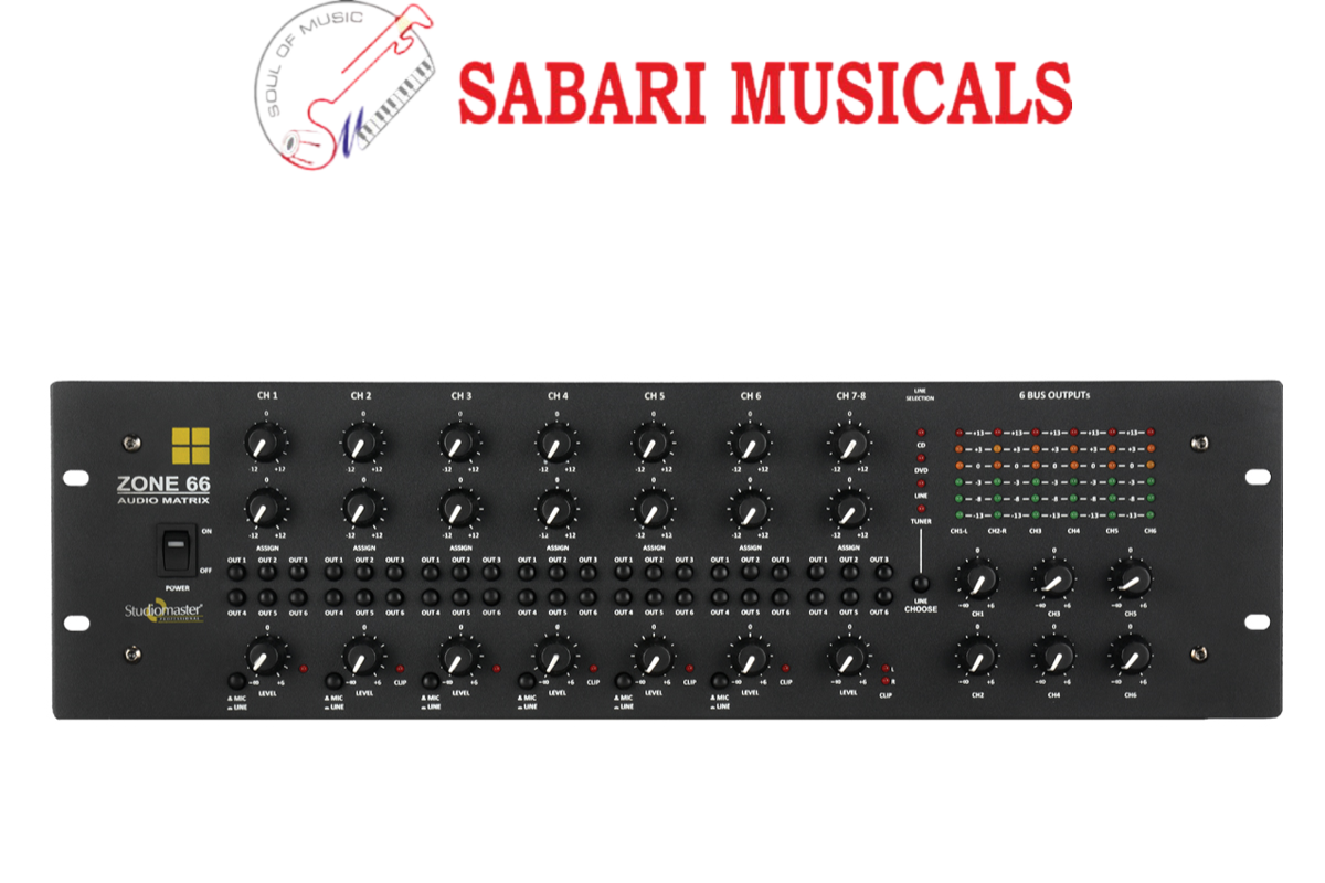 The Studiomaster Mixer Zone 66 is a 6 zone paging method created for a variety of environments such as Factories, Hospitals, Schools, etc. It has 6 Mic/Line inputs switchable to 6 outputs with an objective Gain controller, 2 band equalizer, Level control and CLIP led. There is Matrix assignment: Each input channel can be attached to any combination of outputs. Input connectors are 6X Line ( Stereo RCA), 6X Mic ( XLR ) and 4X Aux ( Stereo RCA ). Output connectors are 6X ( XLR balanced and RCA Unbalanced ).