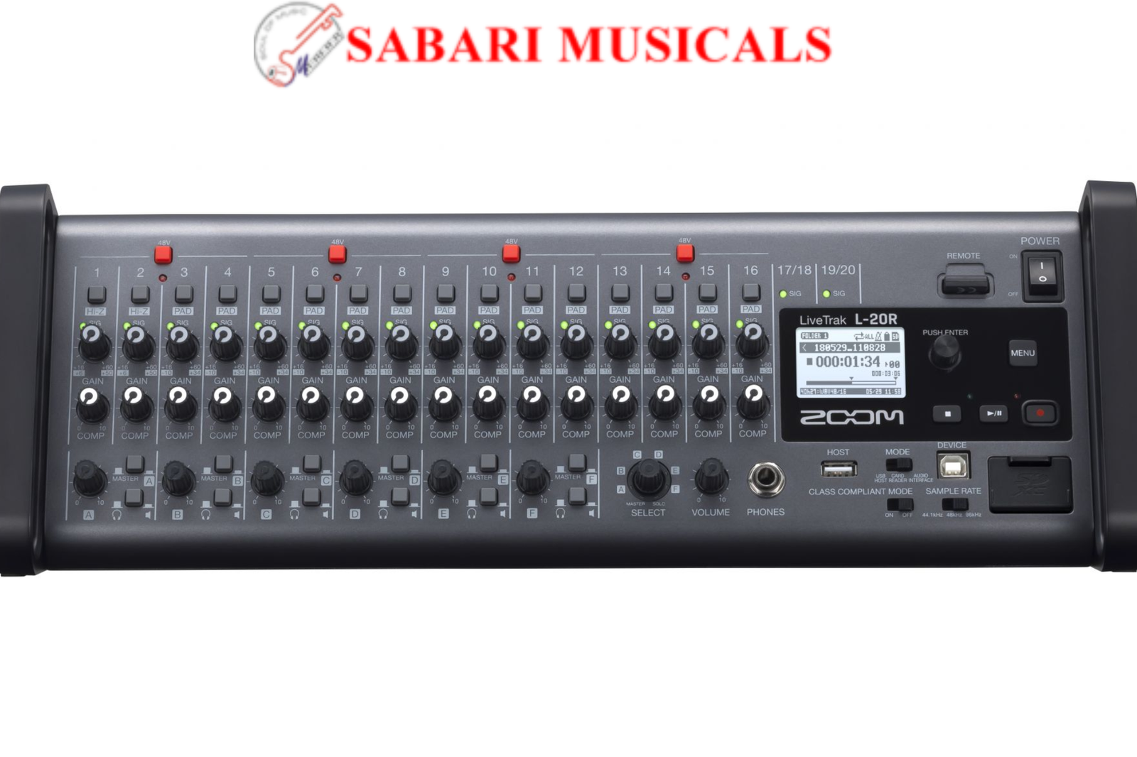 • The highly flexible Zoom LiveTrak L-20R is a 20-input digital mixer and multi-track recorder well suited for live performances, studio recording, band rehearsals, podcasts, and more. Eschewing the faders of the similar L-20 without sacrificing much else, the L-20R is both portable and rack-mountable, even supplying rack ears for mounting the mixer in your rack case. Also, the L-20R sports iPad control. The FOH engineer and up to six musicians can control their own discrete monitor mix over iPads, changing levels, EQ, channel effects, and more.